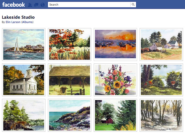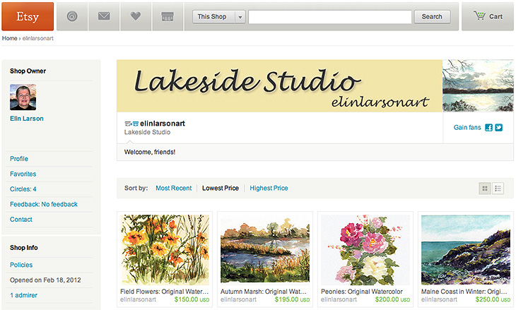 Etsy is a great resource for independent artists and collectors of vintage items. I recommend it as a way to “try out” an online gallery without the expense or complication of setting-up an independent website. Facebook is a free way to share your work and connect with long-lost friends. Here are screenshots from my mom’s Etsy site and her Facebook Gallery, just to give you an idea of how your pages might look.